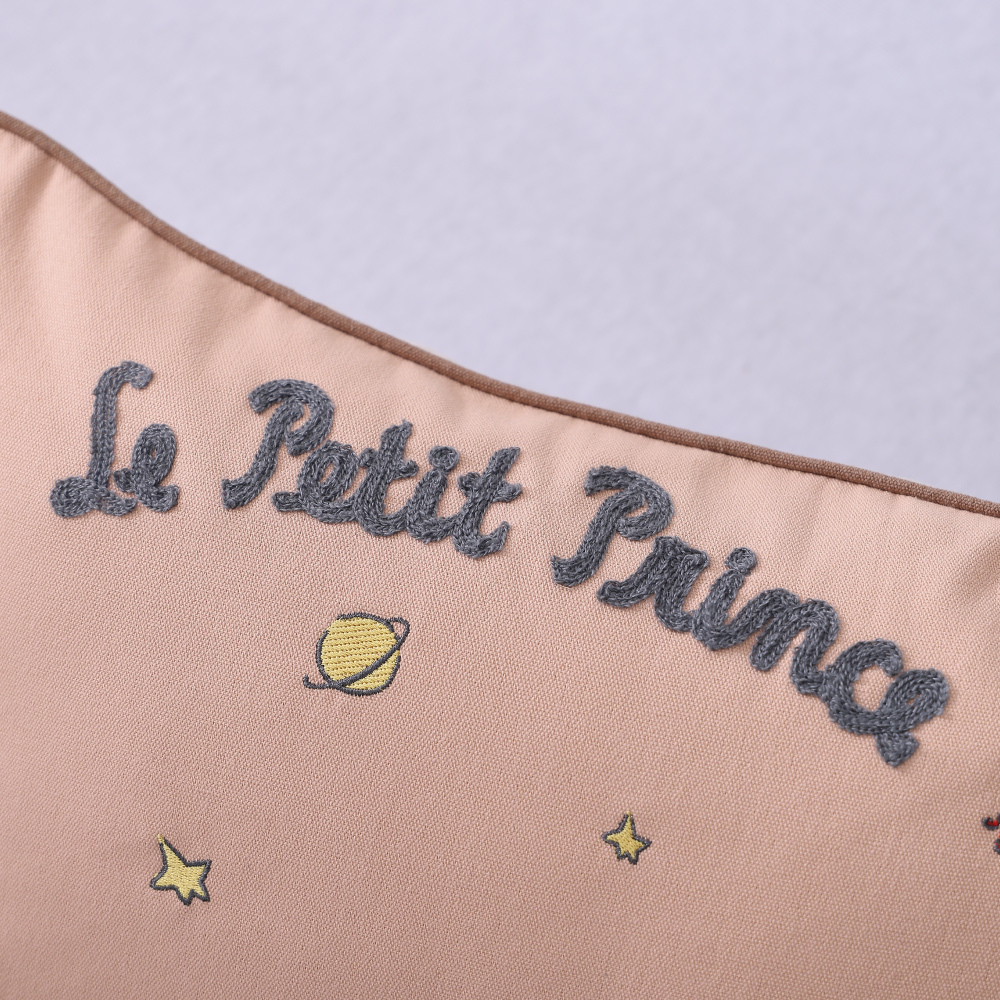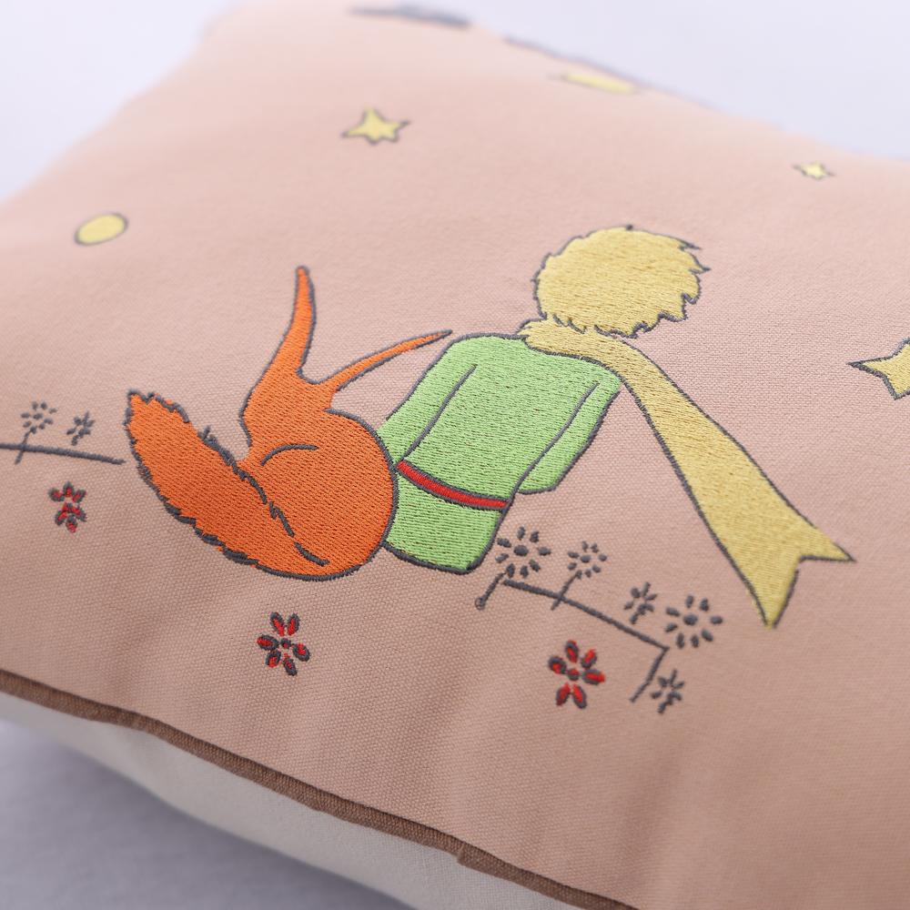 和星空啟航刺繡抱枕一樣為37x53cm的尺寸,但因為此款抱枕是做無側邊的設計,所以看起來會相對較小一些。不同於星空啟航抱枕獨立、探索的故事,「友誼」、「陪伴」是此款抱枕的主題,橫向的設計更適合做為沙發或辦公椅的靠腰墊使用,也象徵著像友誼陪伴一樣在背後作為最堅強的依靠。此款圖案為小王子與狐狸並肩坐著觀賞星空的背影,搭配粉橘色的抱枕底色,象徵著小王子與狐狸彼此馴養之後,生活有如陽光般的燦爛。