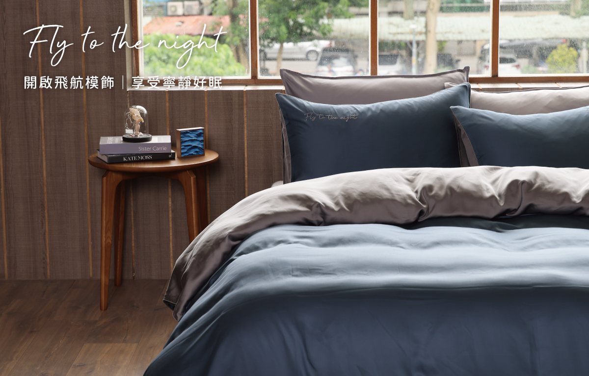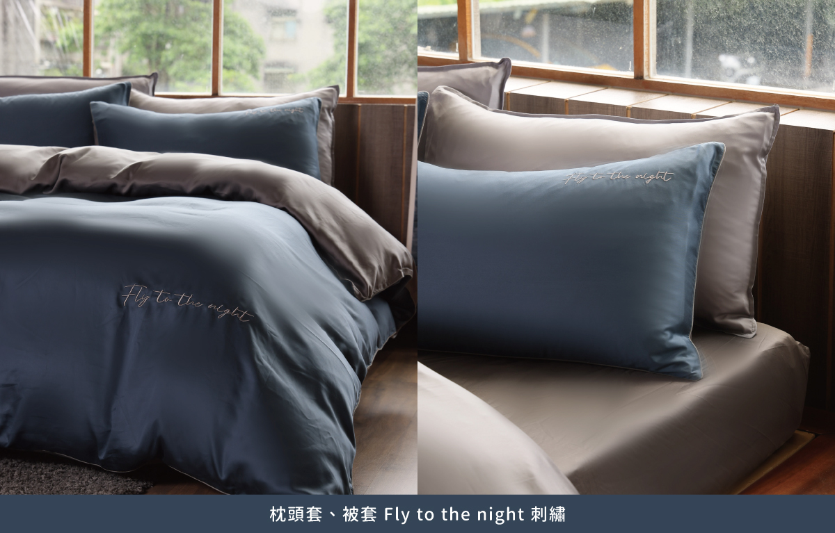 在枕頭套以及被套上皆有 Fly to the night 質感刺繡,簡約而不無聊的素色寢具,象徵每晚都可以航向那個好眠的夜晚。