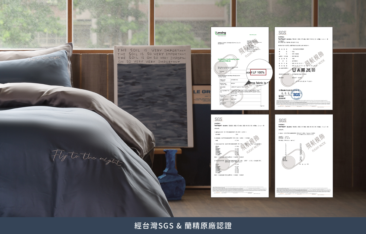 飛航模飾的天絲™商品,經過 台灣SGS & 蘭精原廠認證 ,使用100%無混紡的天絲™萊賽爾材質。