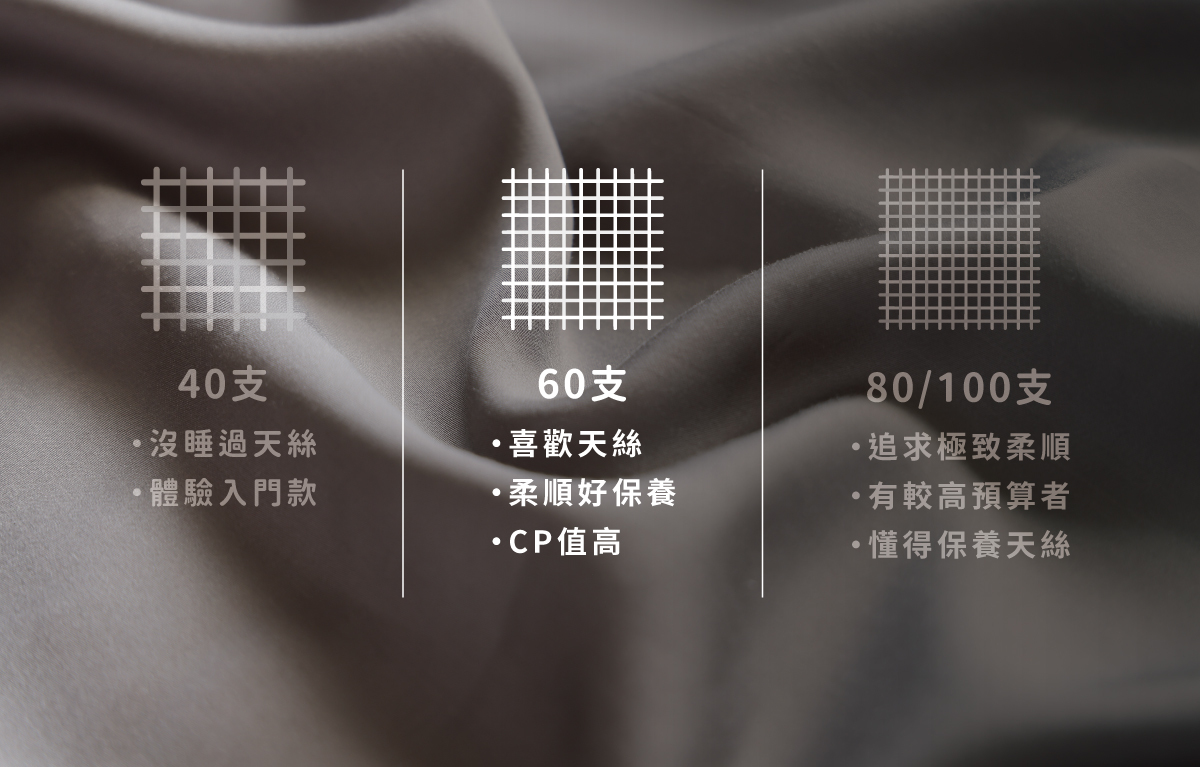 支數代表的是紗線的粗細, 數字越大越柔軟 ,寢具規格中的天絲支數分為 40支、60支、80支、100支。