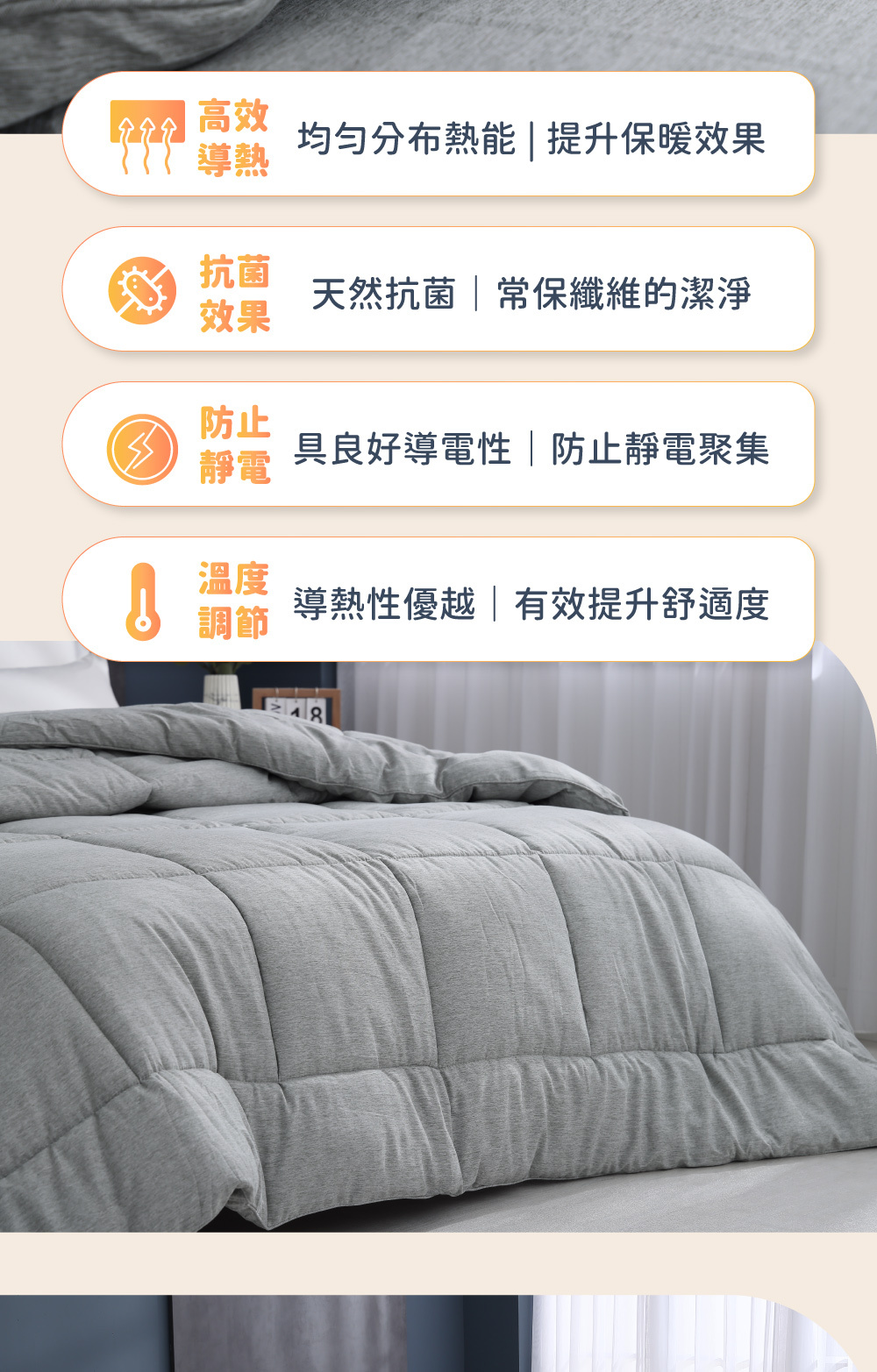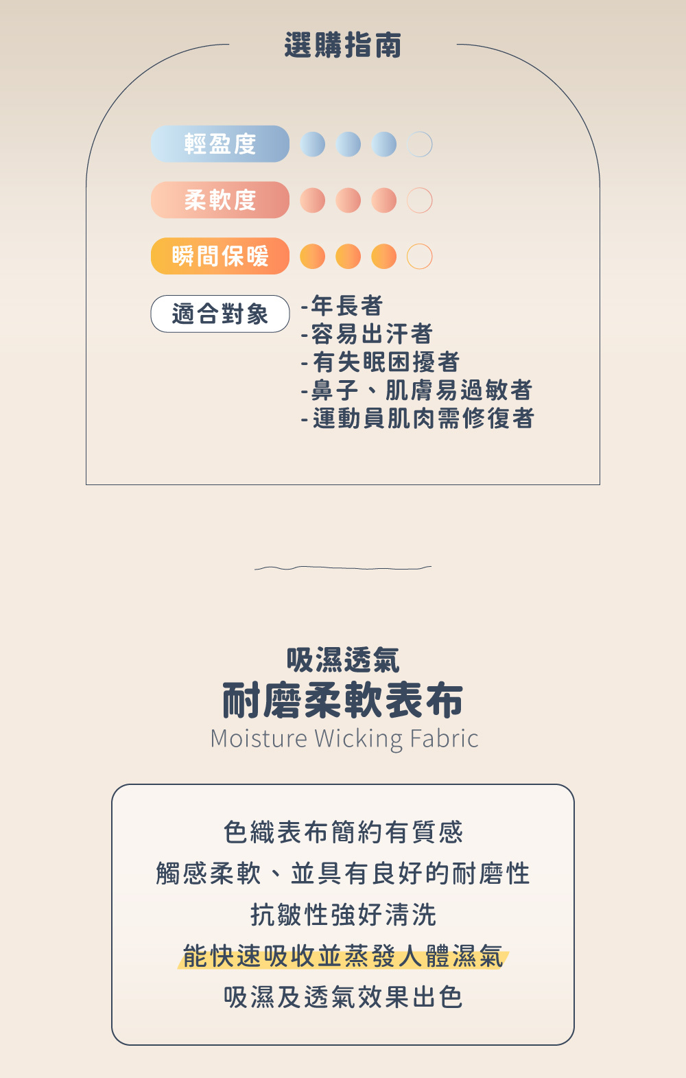 適合對象:輕盈兼具恆溫、易出汗者、敏感肌膚者、年長者、運動員需修復者、有失眠困擾者