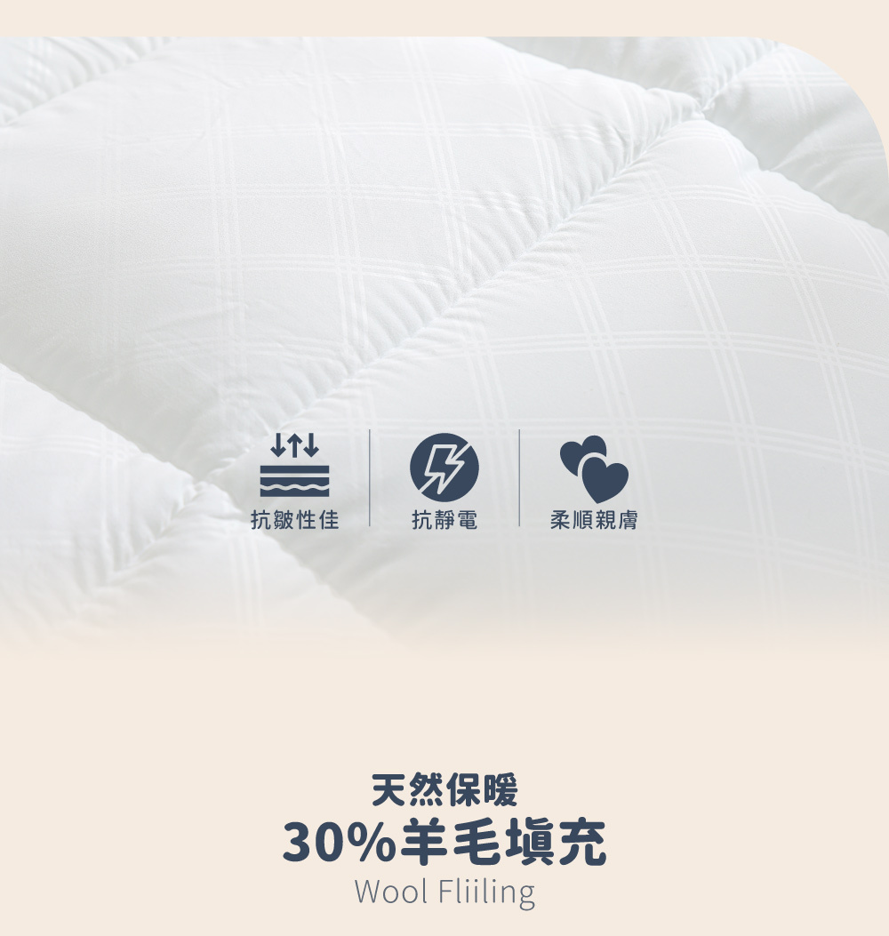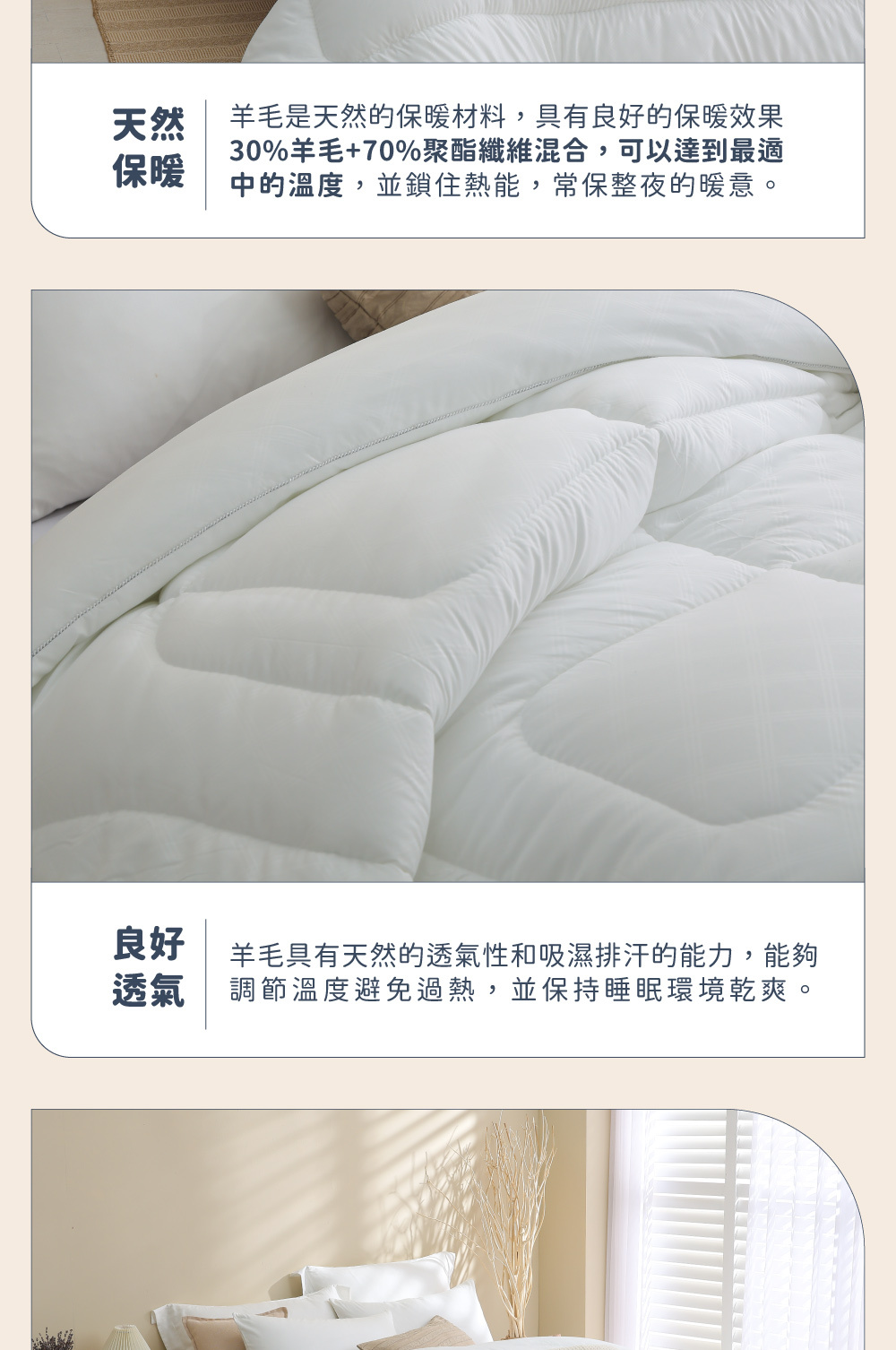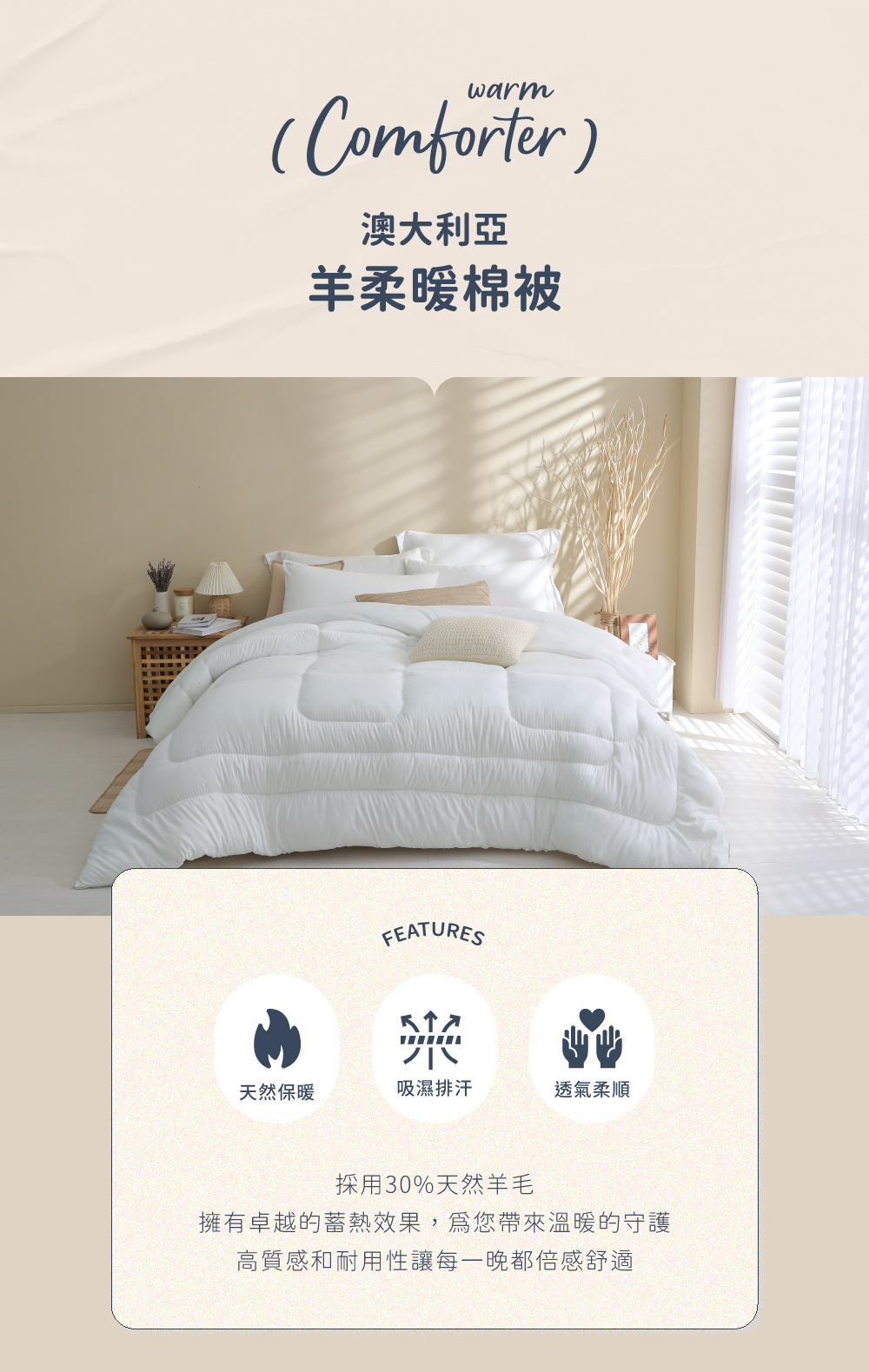 這款澳大利亞羊柔暖眠被採用30%天然羊毛,不但蓄熱性佳、柔順輕盈,羊毛被耐用性佳,只要好好保養、學會適當的羊毛被清洗方式,即可輕鬆延長使用壽命!