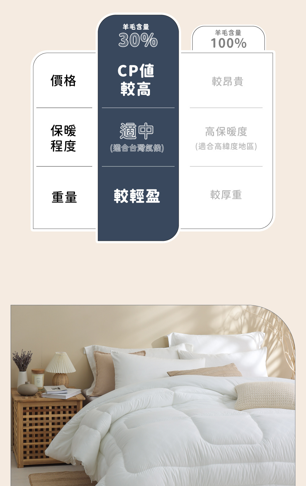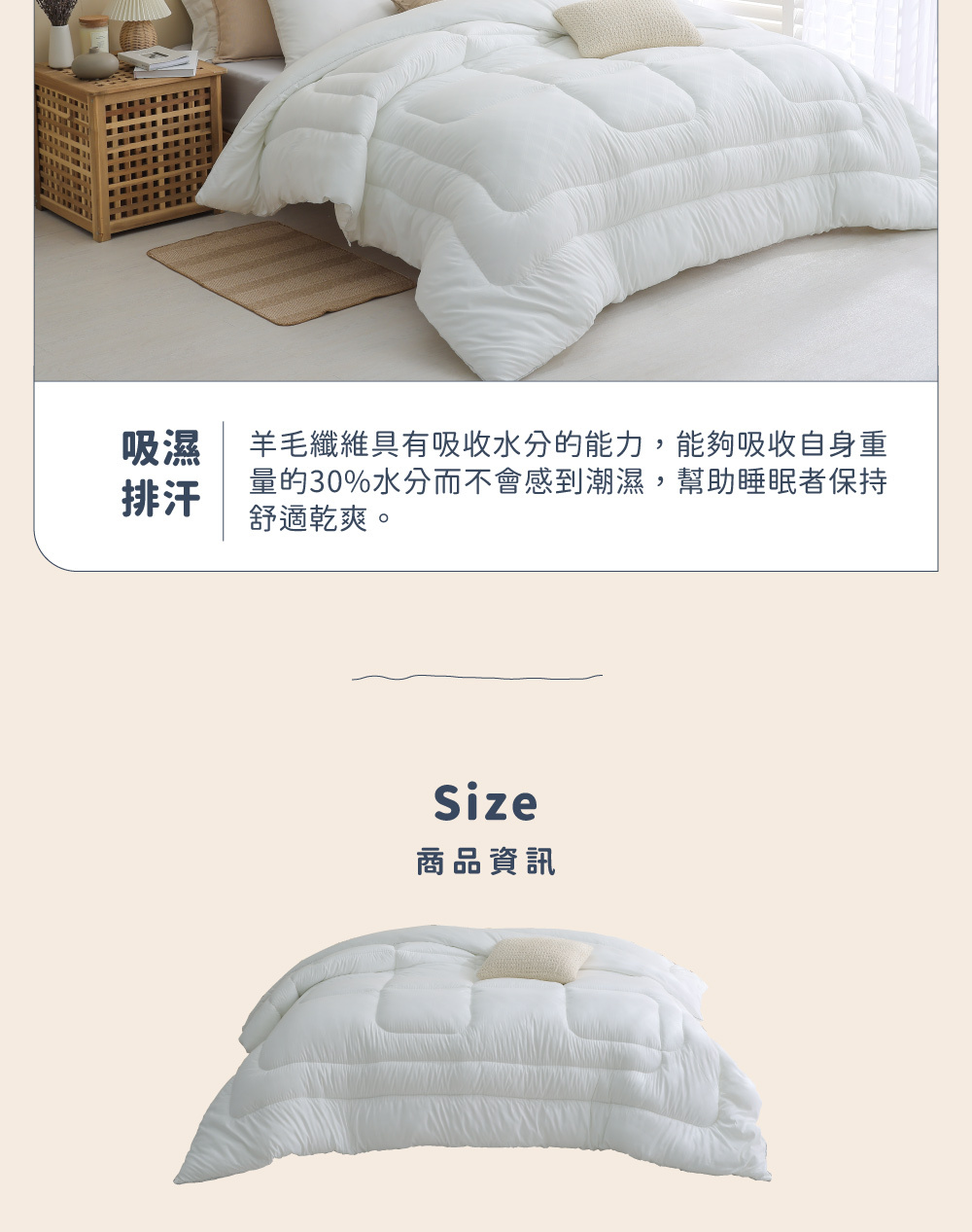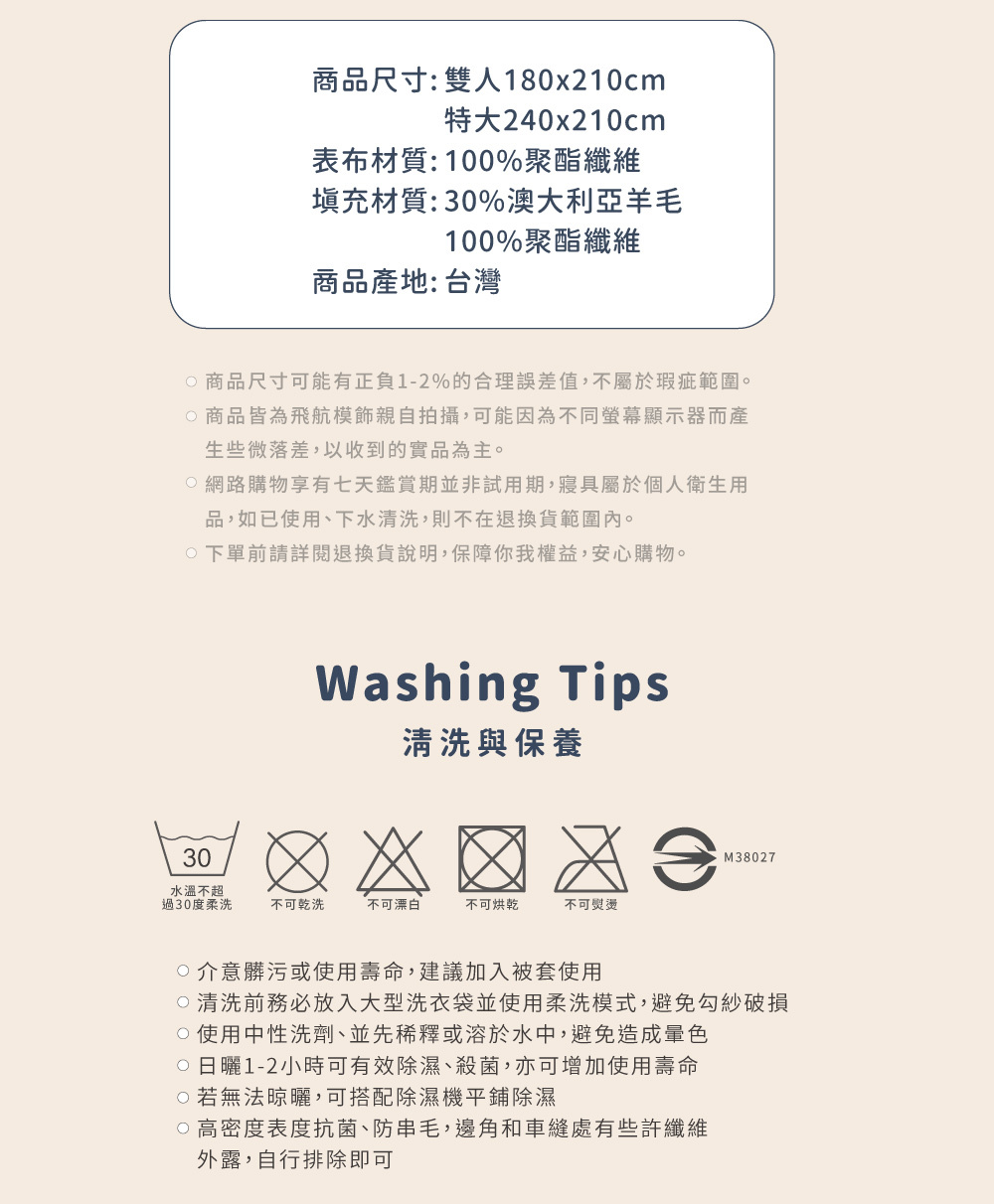 這款澳大利亞羊柔暖眠被採用30%天然羊毛,不但蓄熱性佳、柔順輕盈,羊毛被耐用性佳,只要好好保養、學會適當的羊毛被清洗方式,即可輕鬆延長使用壽命!